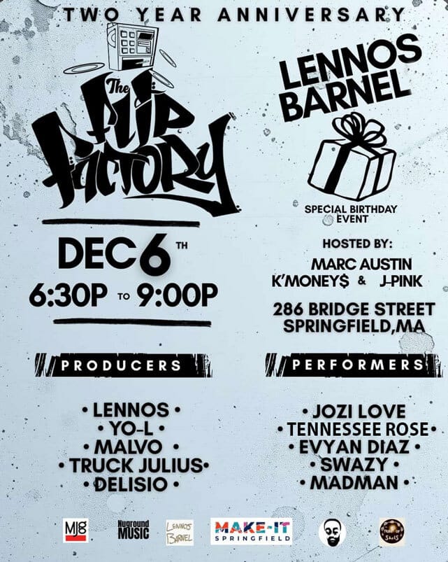In addition to open mics, I’ve been performing with Flip Factory - a collective producers that challenge each other to flip the same sample with their own style and present their work at a showcase. December 6th I’ll be playing my original music on guitar at Make-it-Springfield, a maker-space for the community of Springfield, MA. This marks the 2nd Anniversary of Flip Factory as well as coincides with one of the founding member’s birthday! So, please join me in celebrating!